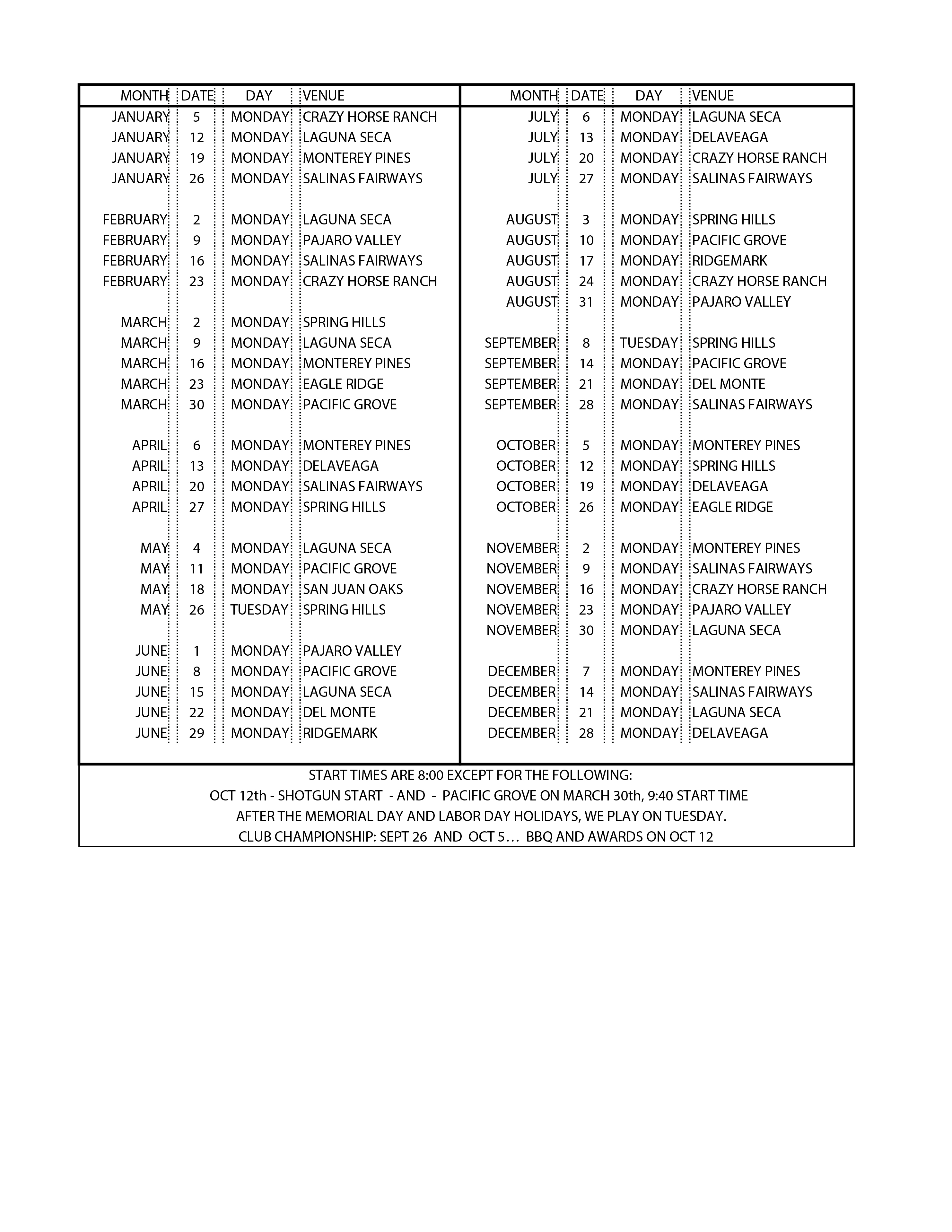 Wednesdays ( except first Wednesday of Lunch Meetings) ….. Assemble at 9:15 for 9:30 games and 11:15 for 11:30 games Mondays we hold Pick-Up games. ….. Assemble on Mondays at 11:00. Just show up. ….. Don’t be shy. Newcomers should just show up and we’ll put you on a team!