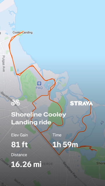 We started  the ride at Shoreline Lake by the boat house parking lot. We traveled north on the San Francisco Bay Trail to Adobe Creek Trail along side of Charleston Slough to Marsh Front Trail and passed through Byxbee Park. We  passed by the Palo Alto Air Port and watched single engine planes taking off and landing. There were many different breeds of foul. We  rode  to Cooley Landing where we took some pictures. Then, we  rode back to Shoreline Lake. There were great views of the Dumbarton Bridge and tidal bay lands.