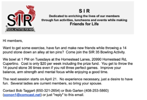 NOTE: State SIR Bowling tournaments are held many times during the year. We have bowlers well into their 80’s and even their 90’s.