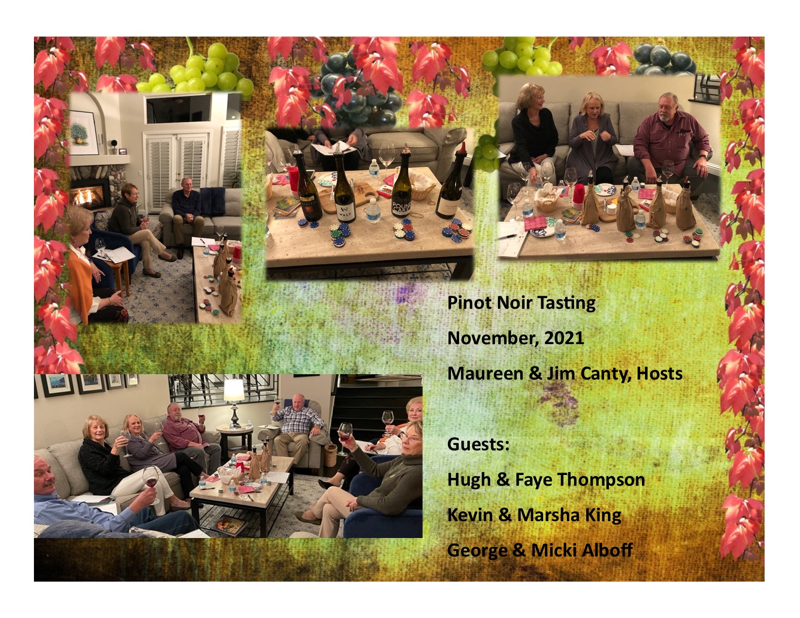 Our inaugural wine tasting activity was held November 18, 2021 at the Canty and Muzio homes. California Pinot Noir was the varietal chosen to kick off our new activity.